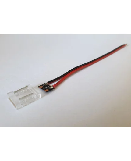 Tape-power transparent connector with connection wires for LED tape 10mm wide. Simple and easy installation.